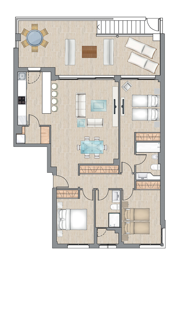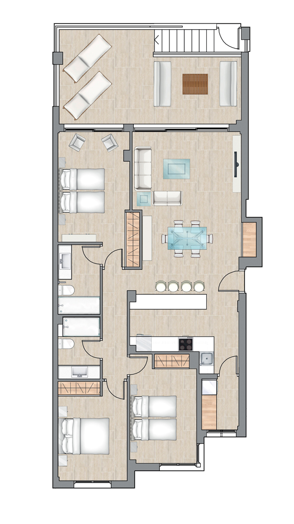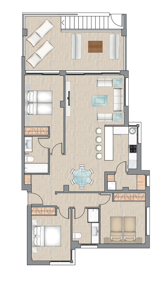 Con una distribución de 3 dormitorios dobles, dos baños con uno de ellos en el dormitorio principal, cocina, salón y grandes terrazas. Las viviendas situadas en planta baja con acceso directo al jardín y piscina comunitaria. Las viviendas emplazadas en planta alta con solárium de uso privado donde se puede instalar, como opción, una piscina privada.